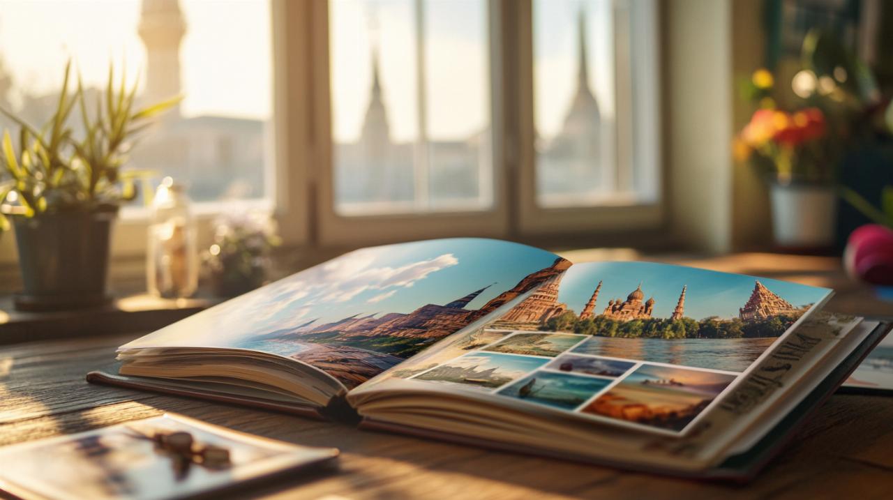 La mixité des supports constitue une technique originale pour enrichir votre album au-delà des simples photographies. Intégrez des billets de transport, des cartes postales glanées en chemin, des tickets d'entrée de monuments ou des fragments de cartes géographiques qui contextualiseront vos images. Ces éléments tangibles ajoutent une dimension tactile et authentique à votre narration, transformant votre album en véritable carnet de voyage multimédia.